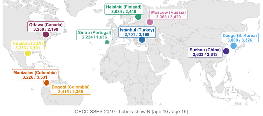 We can then see the changes between 10- and 15-year-olds in each city.