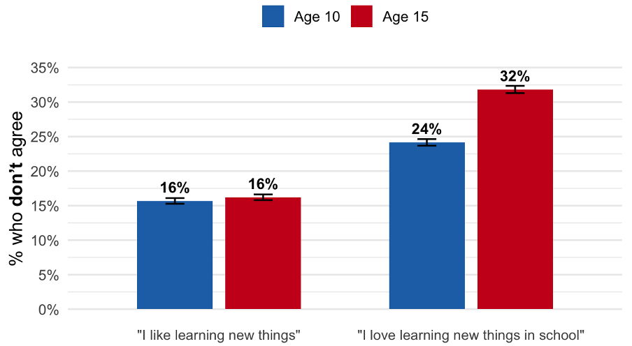 Look again at the difference between those two questions. Only sixteen percent of 10-year-olds don’t agree they like learning new things. The same proportion of 15-year-olds.