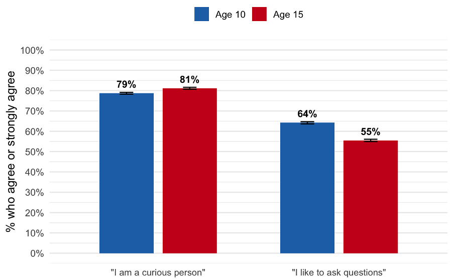 There’s not much in it, but more 15-year-olds are curious about many different things than 10-year-olds. So, curiosity, by that measure, actually increases (slightly) as kids get older.