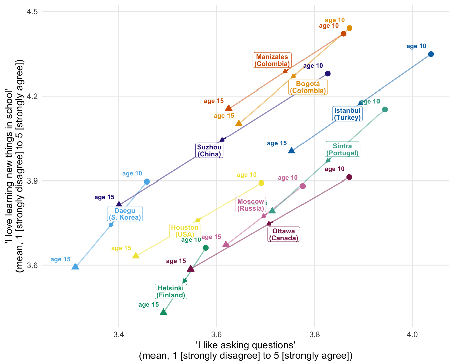In our diverse sample of cities from across the world, something changes for the average student between age ten and age fifteen. They don’t like asking questions as much, as their love of learning new things in school is falling.
